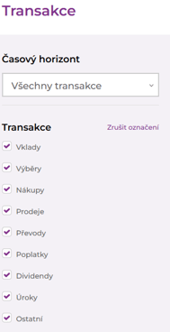2) Vyberte období a typy transakcí, které chcete exportovat.